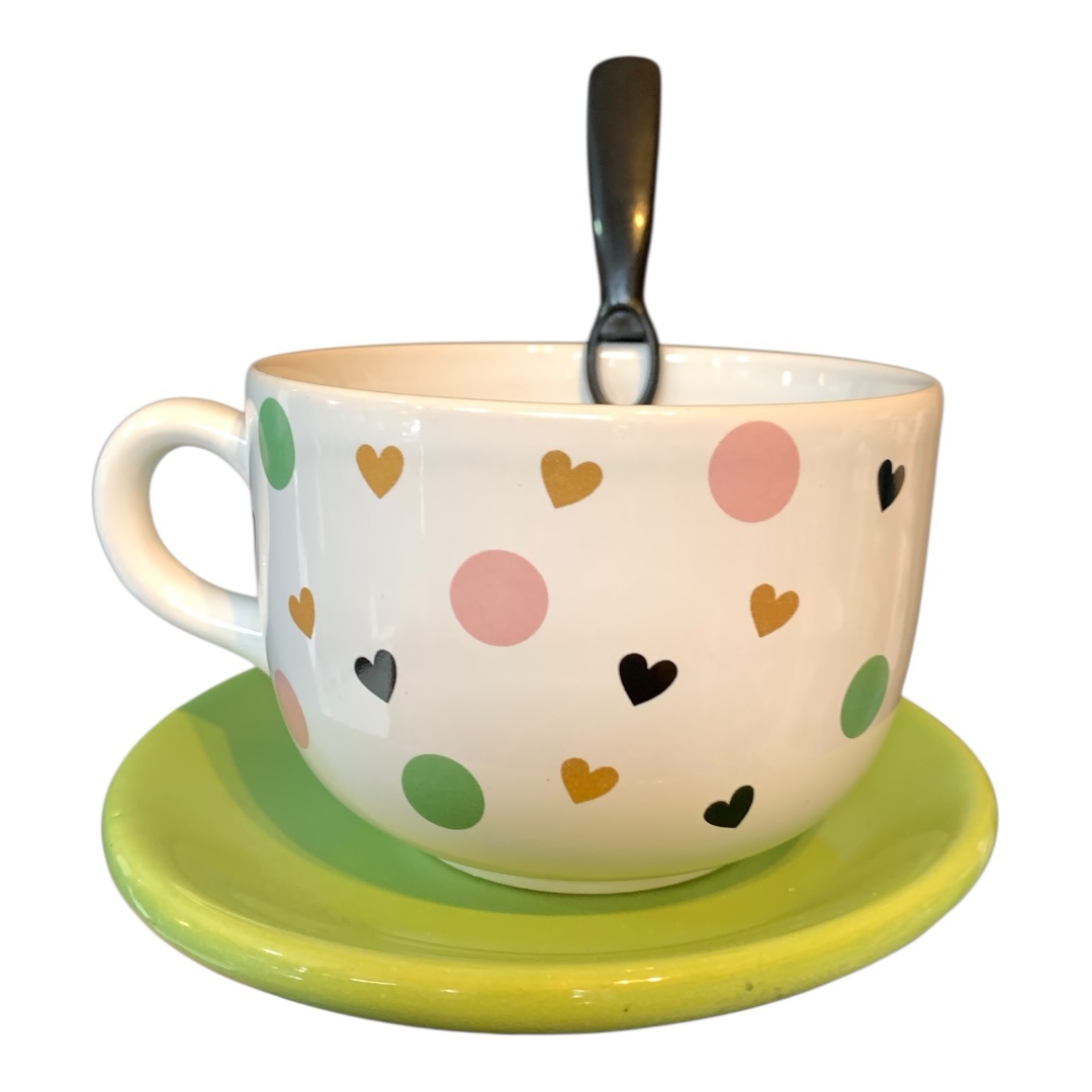 Set compuesto `por tazón base blanca (9×10 cm) con divertidos lunares y corazones multicolor. Acompñado por plato de desayuno ideal para acompañar y servir las galles de tu desayuno. Mas cuchara al tono ( verde, naranja, rosa, negra, blanca)