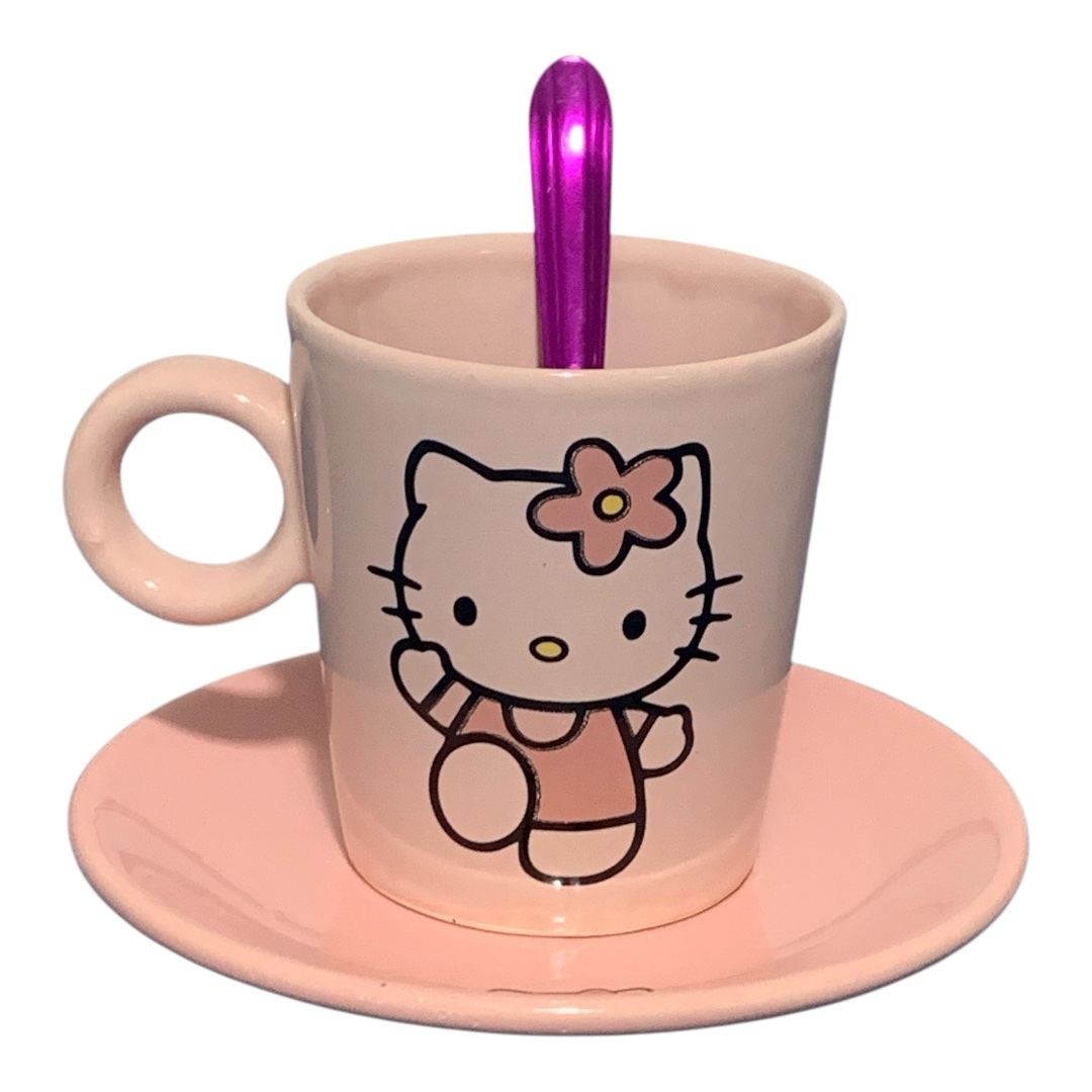 Set compuesto por taza ( manija anillo o manija común- cónica o Bombe ) diseño Kitty rosa+plato+ cuchara de encastre al tono).