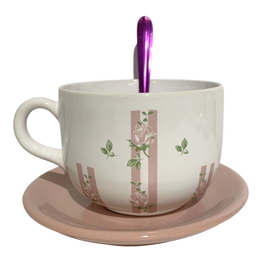 Tazón blanco decorado linea shabby chic rosa, plato rosa + cuchara de acero adonizada.